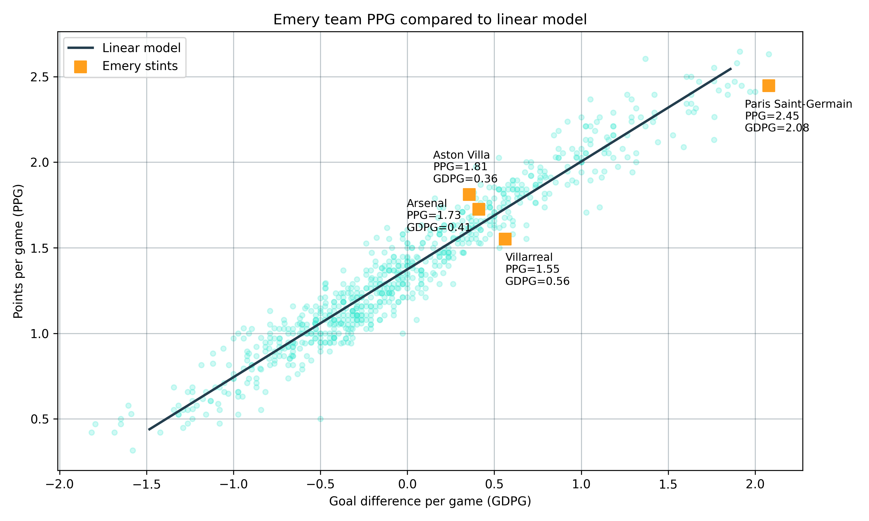 I entered the final points and goal difference for each team in each season of the study period and as you can see below, the relationship is linear. I have plotted the GDPG and PPG for Emery’s stints at his four clubs, and while Aston Villa and Arsenal lie above the line, Villarreal and PSG lie underneath. So it doesn’t seem like Emery is able to consistently overshoot his goal difference.