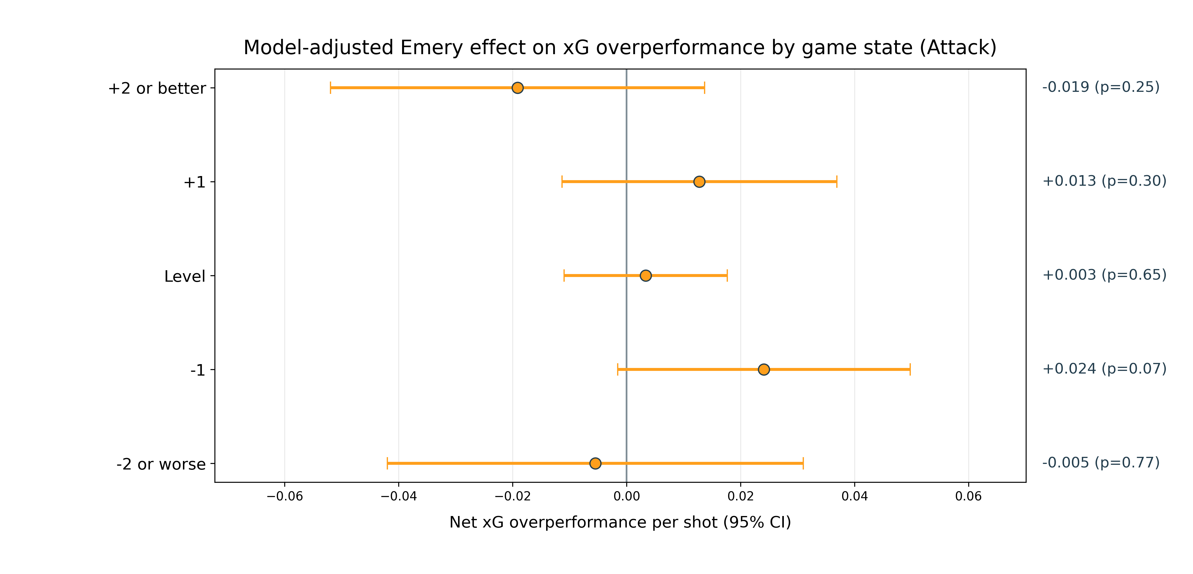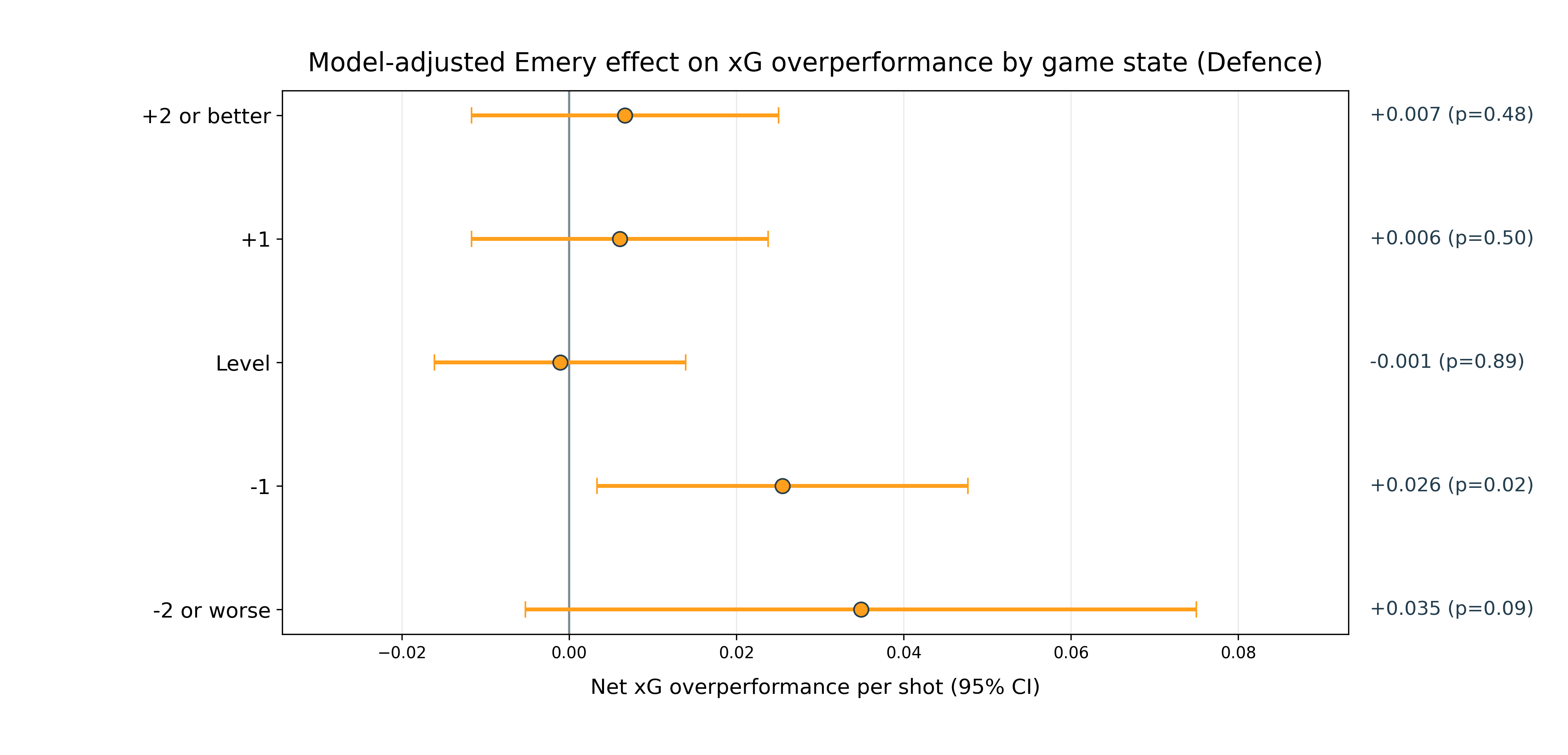 After accounting for team strength, Emery’s teams overperformed xG in attack by 0.024 goals per shot when trailing by one goal, and 0.013 per shot when leading by one goal. They actually underperformed in games that were not close (2 or more goal lead for either team).