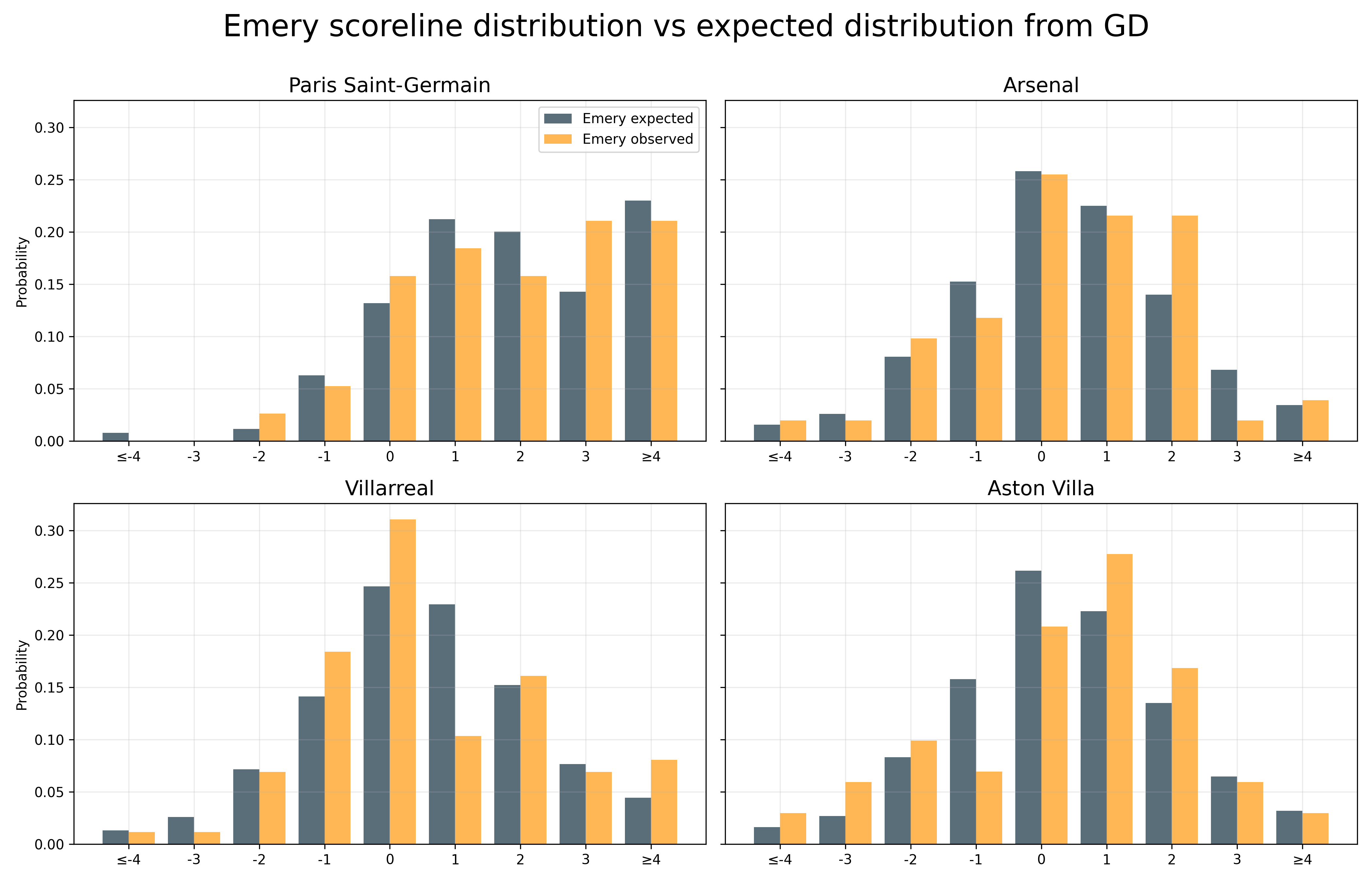Nonetheless, it is clear that Emery has done better, relative to xG, at each of the four clubs than all the other managers collectively. It is also evident that PSG and Arsenal have outperformed xG (by 0.309 and 0.201 per game, respectively, without Emery) across all managers, whereas Aston Villa and Villarreal are close to neutral under non-Emery managers, backing up the hypothesis that wealth begets talent which begets xG overperformance.