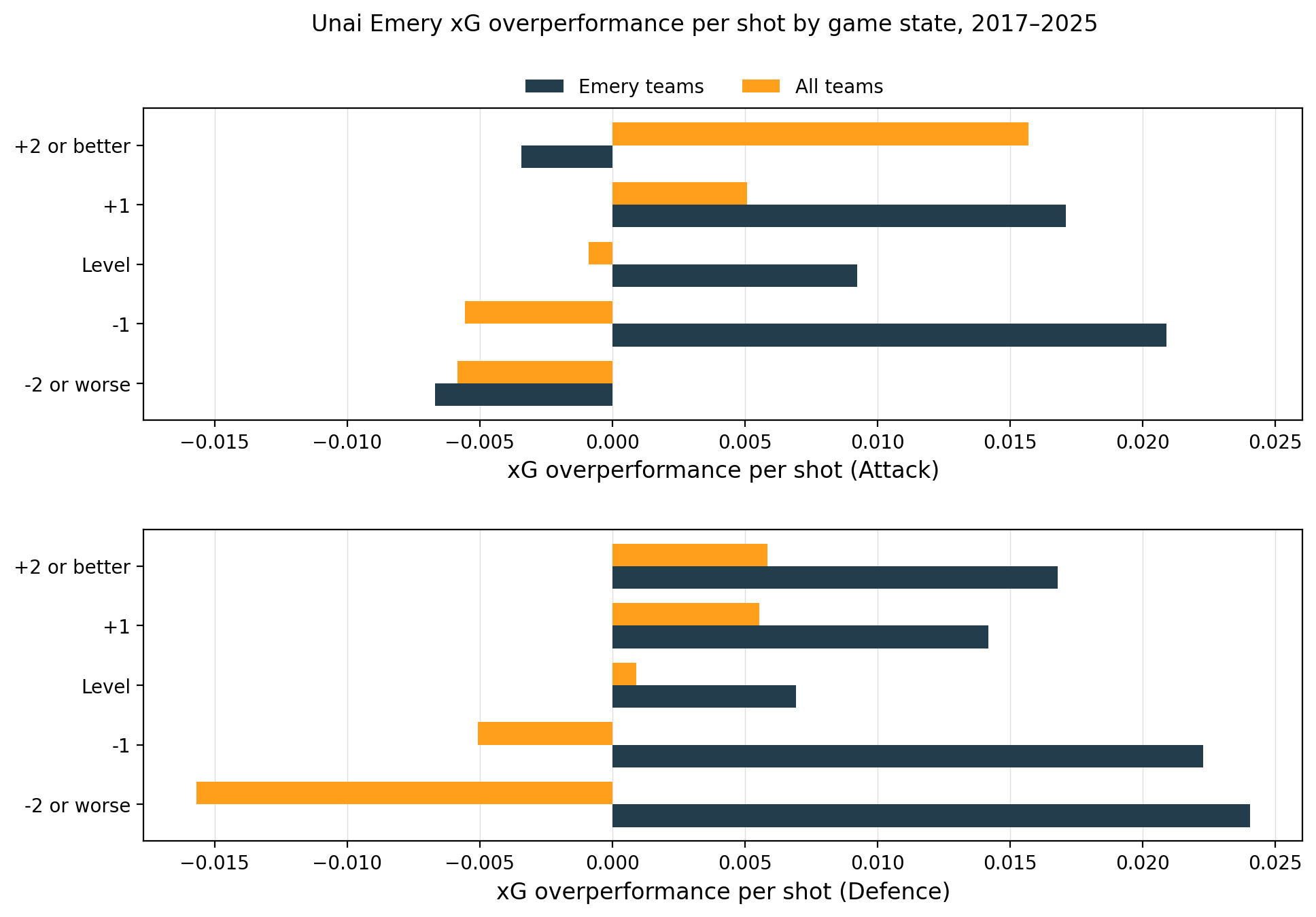 In defence, the largest overperformance was when trailing by two goals (+0.035 goals per shot) followed by one goal (+0.026). So when Emery’s teams were behind by one goal, they outperformed xG by similar amounts both offensively and defensively, and this is the scoreline at which Emery seems to create the biggest edge.