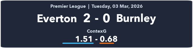 This looks like your classic comfy win for Everton against a very poor Burnley team. It’s hard to know what to make of Everton under David Moyes; 8th place and in the hunt for Europe is incredible, but are they actually any good? ContexG has them at ‒0.26 for the season, sandwiched between Leeds and Spurs who are both in relegation danger.