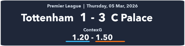 It’s hard to judge this game overall as Palace clearly went into comfort mode in the second half. Spurs lost the contexG 1.20‒1.50, which is an improvement for them on recent efforts, but they will need an uptick in performances and fortune if they are going to fend off the other relegation fighters.