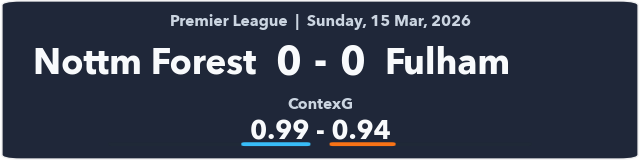 A poor game at the City Ground with only 16 total shots and neither team reaching 20 touches in the penalty area. Fulham’s high line looked shaky at times but they just about escaped a couple of close offside calls.
