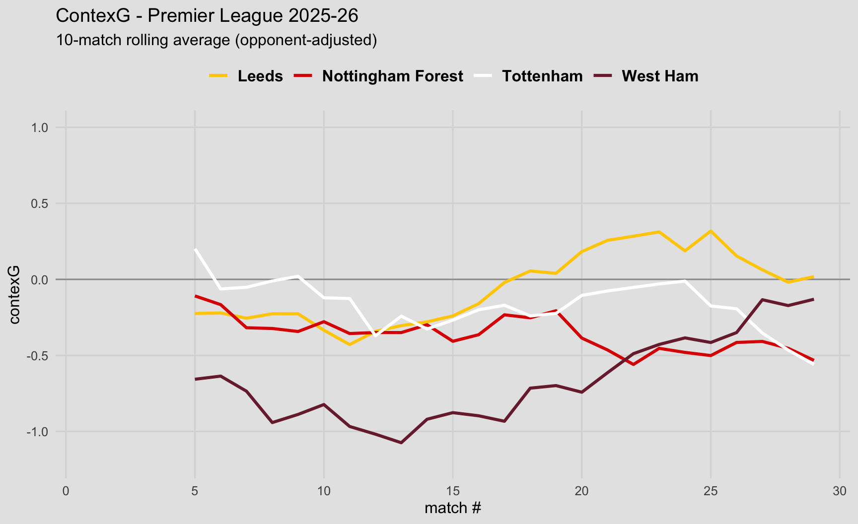 Recent form can also be seen in the above table via the average contexG since January 1st (this number is opponent-adjusted). Forest are the worst of the four teams (-0.53) although Spurs’ woeful three games under Igor Tudor (-1.11) make them the worst team in terms of very-recent form. It is interesting to note that despite West Ham’s dramatic improvement, Leeds still rate more highly since the new year (-0.02).
