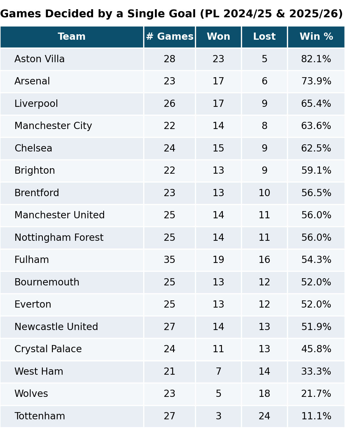 One thing in Spurs’ favour is their superior goal difference of -5 compared to Nottingham Forest (-15) and West Ham (-20). It’s striking that teams could be so close together in the table with vastly different goal differences; the reason for this is Spurs’ astonishingly poor record in games decided by a single goal. Since the start of the 2024-25 season, Spurs have won only three games by a single goal, and lost 24.