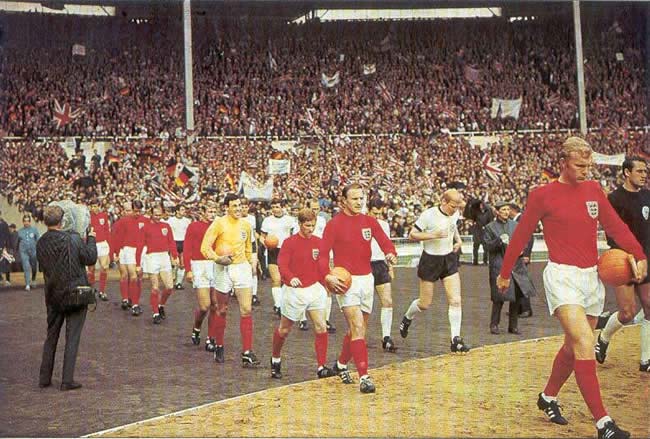 England and West Germany enter the pitch before the 1966 World Cup Final at Wembley. Source: Wikimedia Commons (public domain).