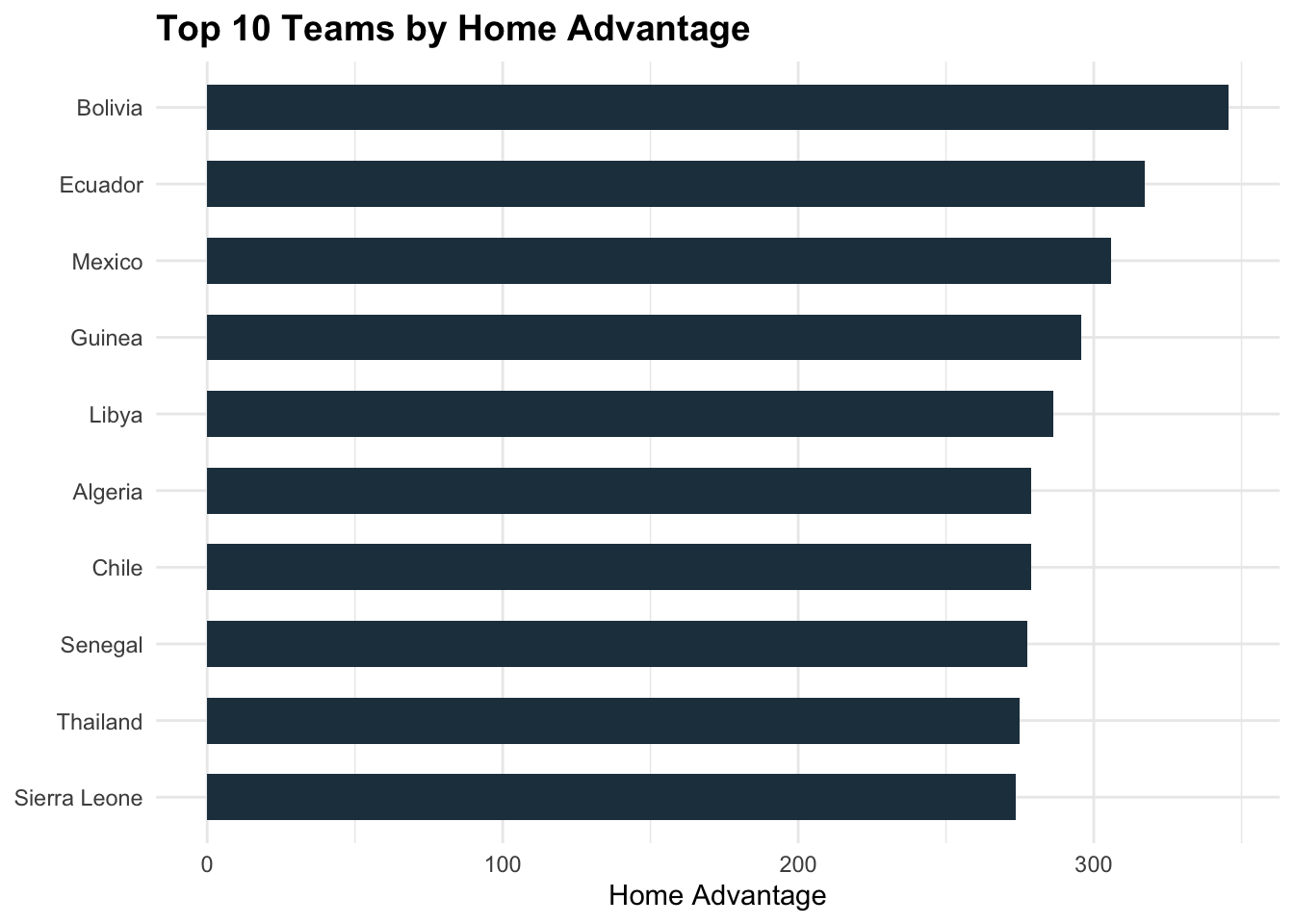 Something that immediately leaps out is that the biggest three home advantages belong to teams who play their home games at a high altitude: Bolivia (La Paz, 13,412 feet), Ecuador (Quito, 9,350 feet) and Mexico (Mexico City, 7,200 feet). Many of the other largest home advantages belong to CAF (African) teams. Conversely, most of the smallest home advantages are found in UEFA teams, with Germany having the smallest of any team and England the 4th-smallest. What could be causing this?